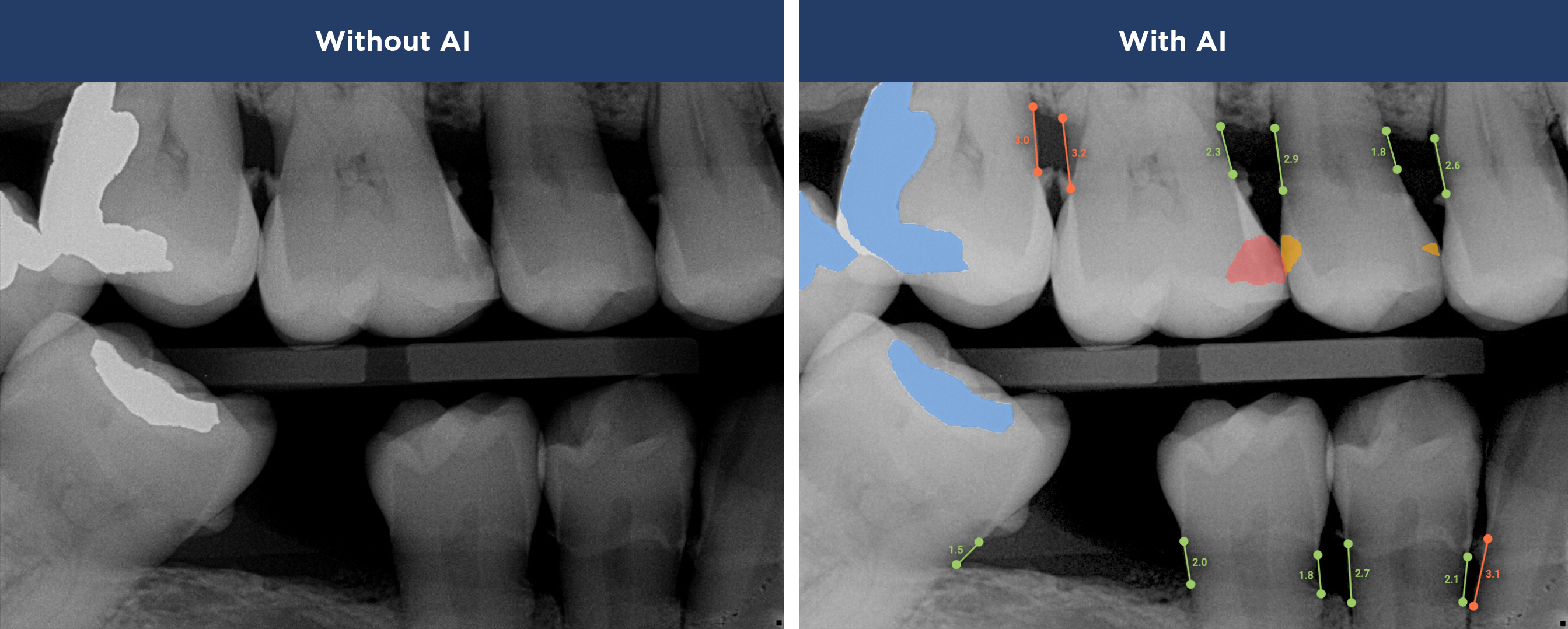 Overjet’s artificial intelligence technology transforms traditional black-and-white X-rays by adding a layer of data that instantly outlines decay (cavities) and measures bone loss. This makes it easy for you to see your results alongside your dentist. It’s like getting a second opinion delivered instantly. With Overjet’s analysis and easy-to-read presentation, you will have the information you need to make an informed decision about your oral health. Together, we’ll review your findings and discuss the best steps to take to achieve your goals.